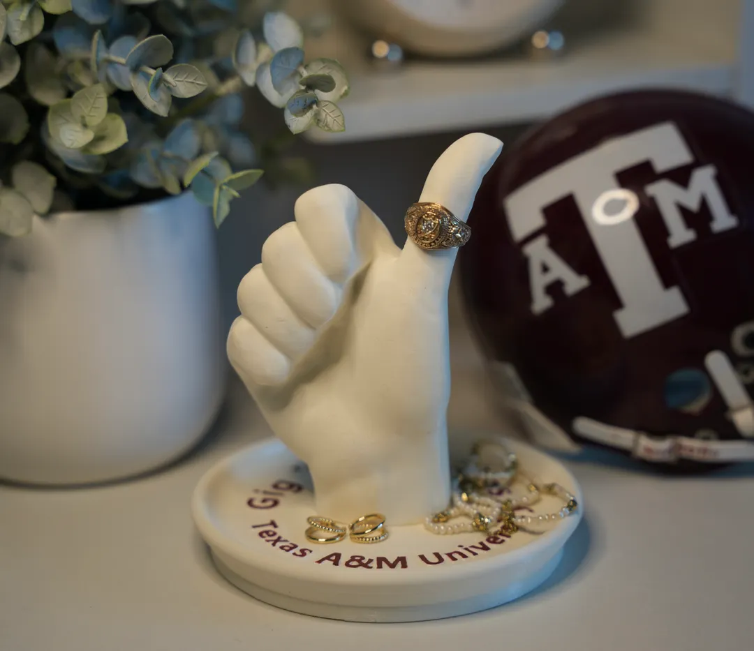 Our collection features elegant white resin and classic wooden ring dishes, each crafted to honor your Aggie ring's legacy. The unique stands showcase the beloved Gig 'Em symbol, emphasizing pride in our traditions and values.